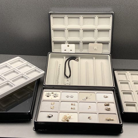 2 stk smykke bakker - måler ca 32,5 cm x 28,5 cm - med almindelige brugsspor på kanter og hjørner. - Lysegrå / mørkegrå — - kan sendes for 57 kr