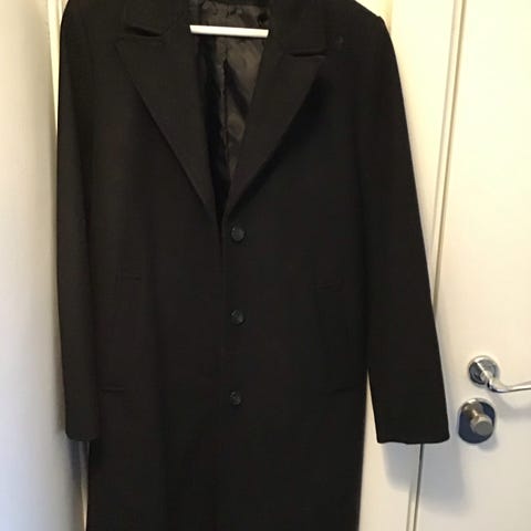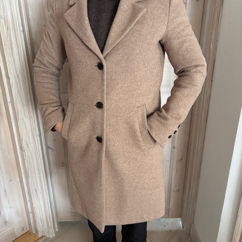 Selected Femme frakke til kvinder i str. 36. Frakken er i lyseblå uld med klassisk reverskrave og knaplukning foran. Modellen har sidelommer og gennemgående foer. En enkel, knælang uldfrakke egnet til hverdagsbrug og mere formelle anledninger i køligere vejr.
