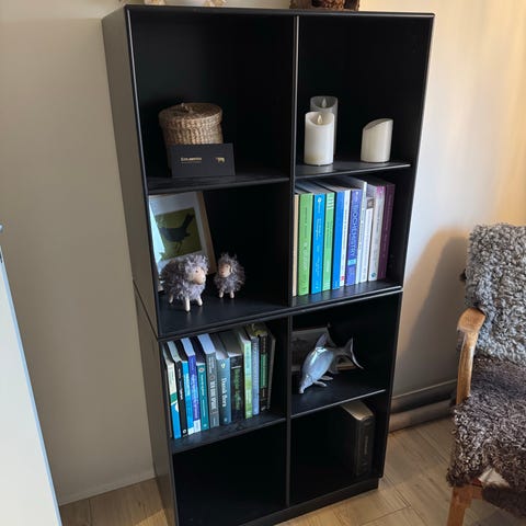 Montana reol model 4161, på stål ben. Farven er "sand". Måler 46x46. Der er 3 grebsløse skuffer og en hylde.