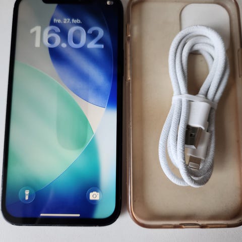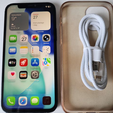 Apple iPhone 12 smartphone i sort. Modellen har skærm med notch og enkelt kamera på bagsiden med LED-blitz. Bagsiden fremstår med tydelige brugsspor og afskalninger i overfladen. Telefonen egner sig til almindelig brug, reservedele eller som erstatningsenhed afhængigt af købers behov og standvurdering ved fysisk gennemgang.