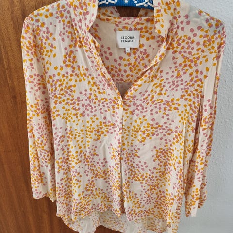 Second Female skjorte til kvinder i størrelse XL. Skjorten er fremstillet i polyester og har et multifarvet mønster i dæmpede nuancer. Klassisk skjortemodel med krave og lange ærmer. Velegnet til hverdagsbrug eller mere formelle anledninger afhængigt af styling.