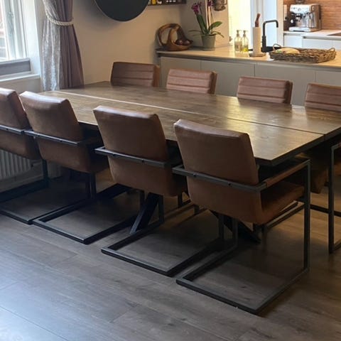 Eksklusivt plankebord fra Kristensen & Kristensen + 5 sorte læderstole med armlæn