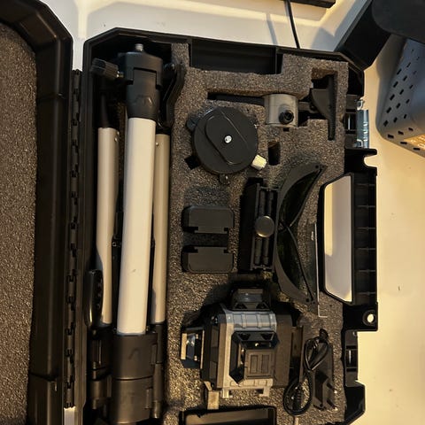 Gravquick 4G nivelleringsinstrument i orange transportkasse. Instrumentet leveres i en hård kasse med bærehåndtag og indvendig polstring til sikker opbevaring. Velegnet til opmåling og nivellering i forbindelse med byggeri og andre tekniske opgaver, hvor præcis højdebestemmelse er nødvendig. Inde i låget findes tekniske specifikationer på en metalplade. Sættet indeholder selve nivelleringsinstrumentet samt tilbehør som vist på billederne.