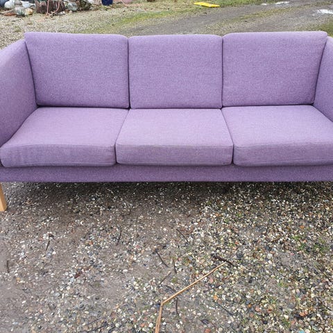 Den er behagelig at sidde i - hynderne trænger til en rensning. Stabil konstruktion og solide armlæn i træ.