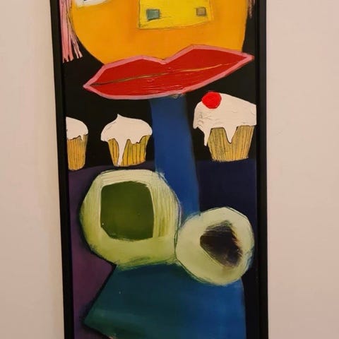 Abstrakt maleri i lyse nuancer med sort og guld