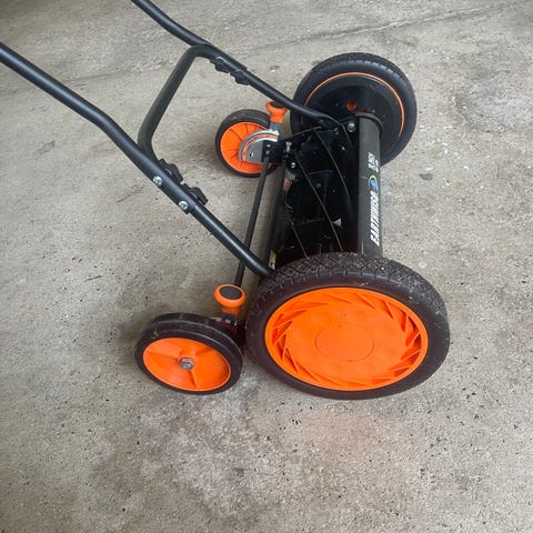 Manuel cylinderplæneklipper i orange med sort stel og hjul. Plæneklipperen har håndskub med bøjlehåndtag og cylinderknive, der klipper græsset ved fremdrift fra hjulene. Egnet til mindre græsplæner, hvor der ønskes en enkel, mekanisk klipning uden motor eller strøm. Justerbar klippehøjde kan indstilles via regulering ved hjulene. Velegnet til almindelig havebrug.