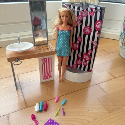 Barbie dukke med badekar og badeværelsessæt. Sættet indeholder en Barbie dukke i stribet badedragt, et badekar i hvid og pink med armatur samt kurv til tilbehør, en fritstående håndvask med spejl og skuffe samt små badeværelsesaccessories som børste og flasker.