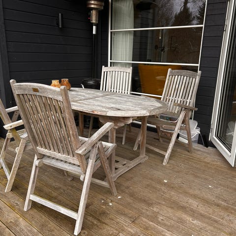 1 Havebord (b: 100cm og l:200) med indlægsplade (l: 65cm), 1 havebænk (l: 189) og 2 havestole med hynder som på foto.