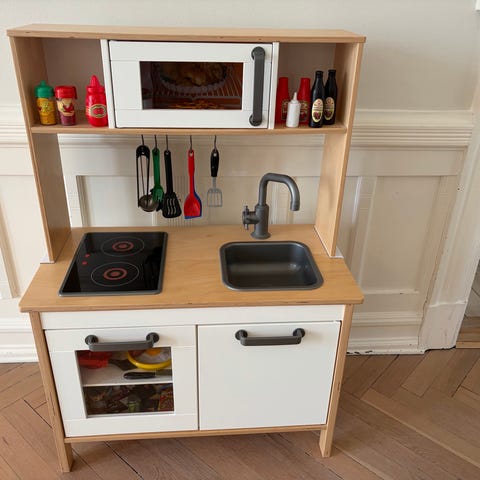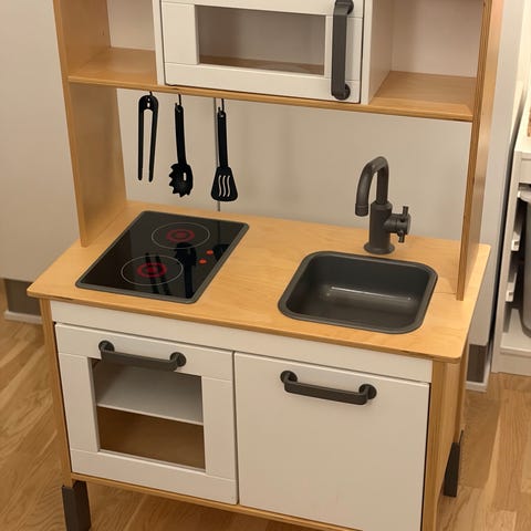 Legekøkken i træ med komfur og vask. Legekøkkenet har to kogeplader, ovn, vask med vandhane, hylder til opbevaring samt en lille mikroovn/overskab. Egnet til rolleleg for børn og kan bruges indendørs på børneværelset eller i legeområder. Fremstillet primært i træ og plastdele.