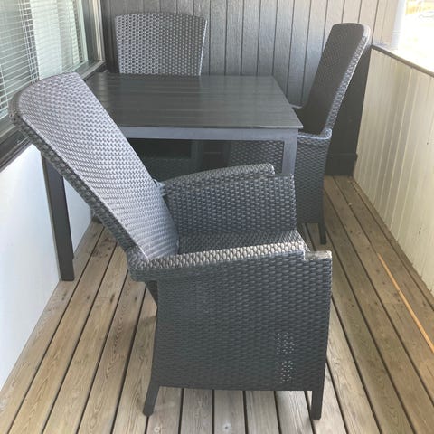 Havebord sæt med kvadratisk bord og to stole i grå polyrattan. Bordet har en søjlefod med firkantet fodplade og lamelbordplade. Stolene har armlæn og flettet sæde og ryg i samme materiale. Egnet til udendørs brug på terrasse, altan eller i have.