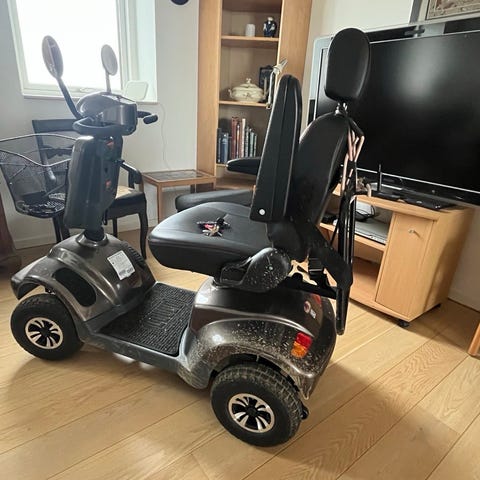 El-scooter 4-hjulet i grå med sort sæde og armlæn. Scooteren har styr med betjeningspanel og display, der viser bl.a. hastighed og batteristatus. Foran er der monteret en kurv til opbevaring af mindre ting. Bagpå er der bagagebærer. Der medfølger oplader og forlængerledning samt et sort overtræk/presenning til afdækning af scooteren ved opbevaring. Velegnet som hjælpemiddel til persontransport på korte og mellemlange ture på jævnt underlag.