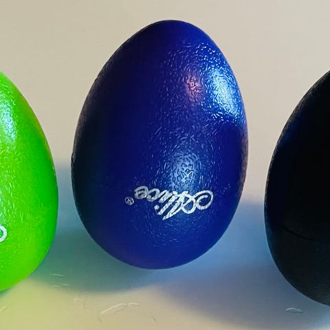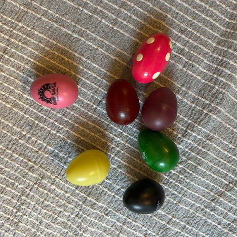 2 Rytme æg, EGGZ by rhythm tech. 5,5 cm x 4 cm. Æggene indeholder små "sten" som rasler når man ryster dem. Samlet pris.