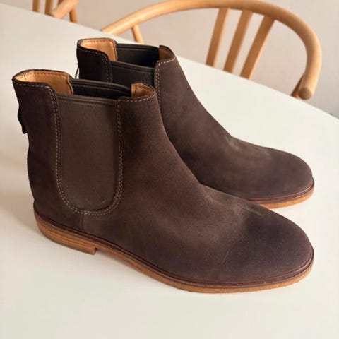 Clarks støvler i str. 44. Klassiske ankelstøvler i brun ruskind med elastikpaneler i siderne og strop bagpå skaftet. Støvlerne har en lys syning langs sålen og en flad gummisål, der giver et enkelt og neutralt udtryk. Velegnet som hverdagssko.