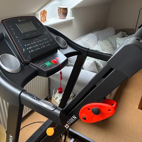 Løbebåndet har digitalt display med visning af blandt andet tid, distance, hastighed og kalorier samt betjeningsknapper på konsollen. Der er sikkerhedsnøgle på fronten. Båndet kan klappes op, så det fylder mindre ved opbevaring. Egnet til gang og løb indendørs i hjemmet.