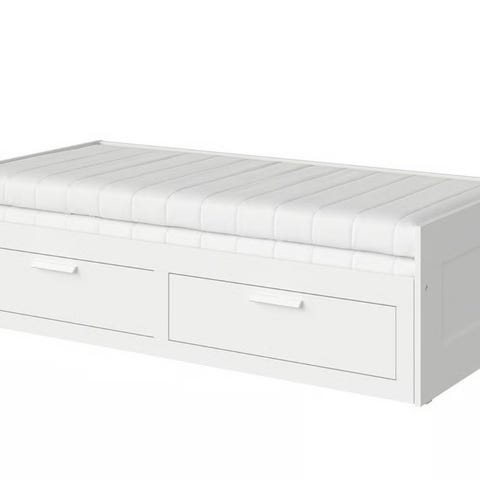 IKEA BRIMNES seng med opbevaring i hvid. Sengen måler 80x200 cm og har integrerede skuffer under liggefladen til opbevaring af fx sengetøj eller tøj. Velegnet til brug i soveværelse, gæsteværelse eller mindre rum, hvor der er behov for ekstra opbevaringsplads under sengen. Inklusiv 2 stk. Åsvang skummadrasser.