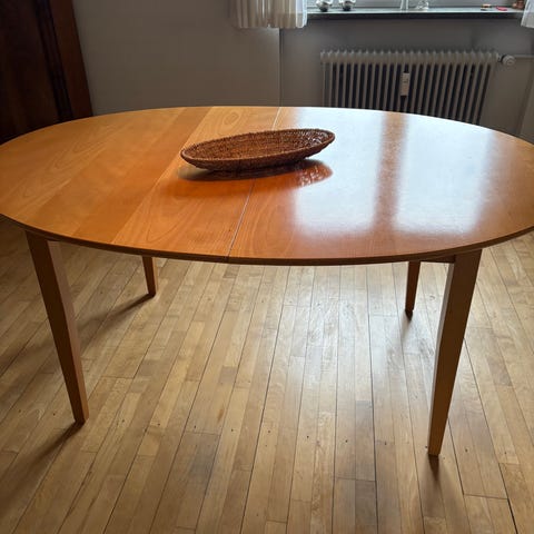 Udtræksplade medfølger, den er dog i spånplade og matcher altså ikke træet. Pladen øger bordets længde med 60cm.