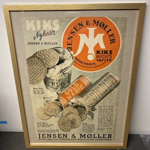 Gammel original helsides reklame for kiks: Store Marie fra Jensen & Møller A/S. Rammemål 29 x 35 cm. Sender gerne men ikke via “fiks færdig”. Køber betaler porto.