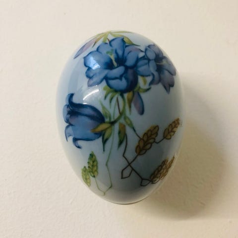 Smukt lille bonbonniere formet som et æg. På låget er en æblegren i blomst. Lavet i 1988 i 5000 eksemplarer. Måler ca 6 cm og er 1.sort. I fineste stand. Et yndet samleobjekt.