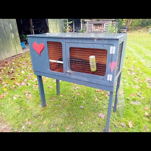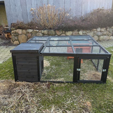 Udendørs bur eller løbegård til kanin, marsvin eller lignende. Er hjemmebygget, godt slidt og lidt ustabilt, men fungerer glimrende hvis det bare er til kaninen, der skal have lidt græs under poterne.