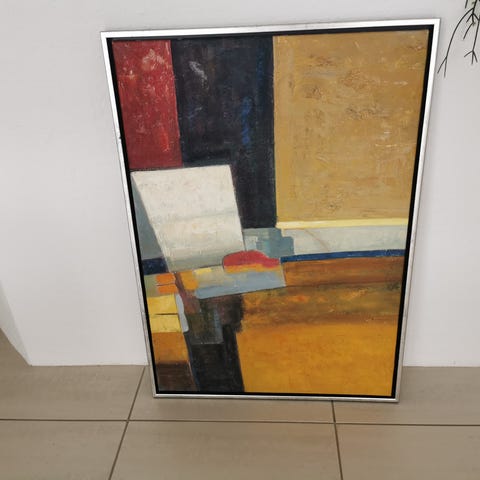 Oliemaleri, b: 34 h: 34, OLIEMALERI PÅ LÆRRED MED SØLVRAMME.