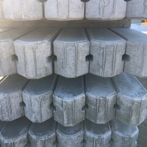Betonstolper med påmonterede metalbeslag i toppen. Stolperne fremstår rå og brugte med synlige brugsspor. Velegnet til f.eks. hegn, afskærmning eller andre udendørs konstruktioner, hvor der ønskes solide betonstolper med fastgørelsesbeslag.