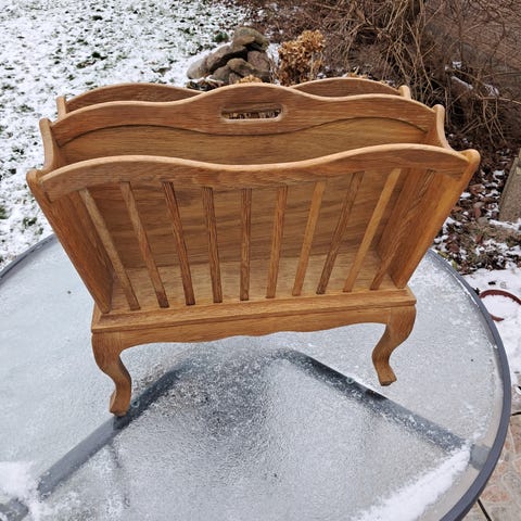 Kai Kristiansen magasinholder / avisholder i massiv eg med tappede samlinger. Lærredet fremstår med en enkelt lille plet ellers super stand. Længde 49,5cm, bredde 23cm, højde 40cm.