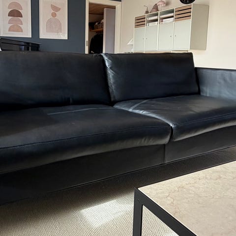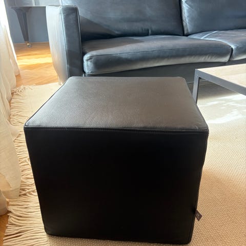 Eilersen puf i mørkt læder. Rektangulær puf med glat læderbetræk. Velegnet som ekstra siddeplads eller som fodskammel foran sofa eller lænestol. Også velegnet som lavt bord med bakke ovenpå. Nypris for tilsvarende model 11.500