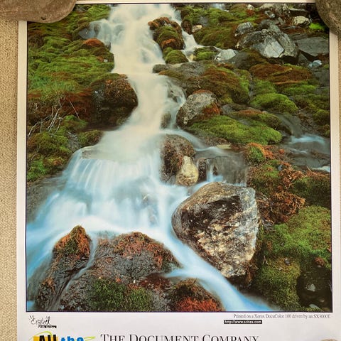 Plakat med naturmotiv af vandfald og klipper. Motivet viser rindende vand gennem klipper i blågrønne og grå nuancer.