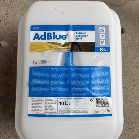 AdBlue dieseludstødningsvæske i tre plastdunke. Væsken anvendes til køretøjer med SCR-system til reduktion af NOx-udledning i dieselmotorer. Leveres i standarddunke med skruelåg og bærehåndtag, egnet til opbevaring og påfyldning efter producentens anvisninger.