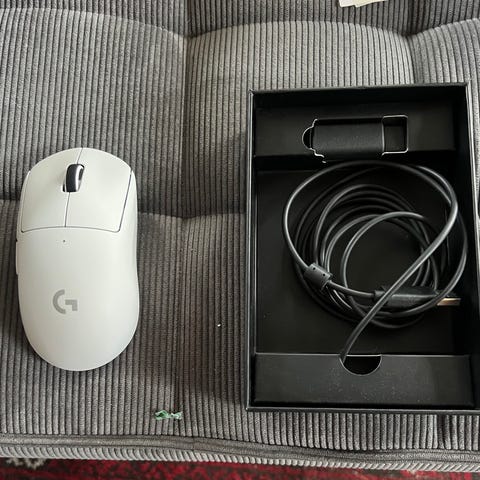 Logitech G Pro X Superlight trådløs gaming mus i hvid. Musen er designet til brug med computer og leveres med trådløs USB-modtager og tilhørende USB-kabel. Egnet til gaming og almindeligt computerbrug, med knapper placeret på toppen og siden af musen. Farven er hvid, og musen er formet til højrehåndsbrug.