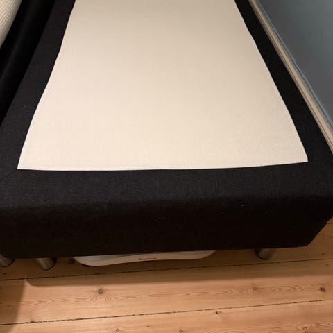 IKEA boxmadras med tilhørende topmadras i hvidt betræk. Sengen står på ben i lyst træ, som giver god frihøjde under sengen til rengøring eller opbevaring. Boxmadrassen har quiltet betræk, og topmadrassen ligger løst ovenpå. Velegnet som enkeltseng i soveværelse, gæsteværelse eller ungdomsværelse.