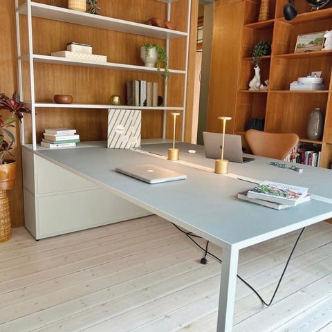 Kan bruges som kontor 'vogn'. Design er af Stefan Diez og er et fantastisk reolsystem i stål. Skufferne åbnes med et "push-to-open"-system - tryk på skuffen, og den åbner. De forreste hjul kan låses, så skabet står fast. Der er også nøgler til, så det kan låses.