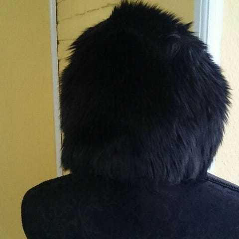 Den har kunstpels i kant og ved ørene. Thermostof som foer. Nypris 499,-