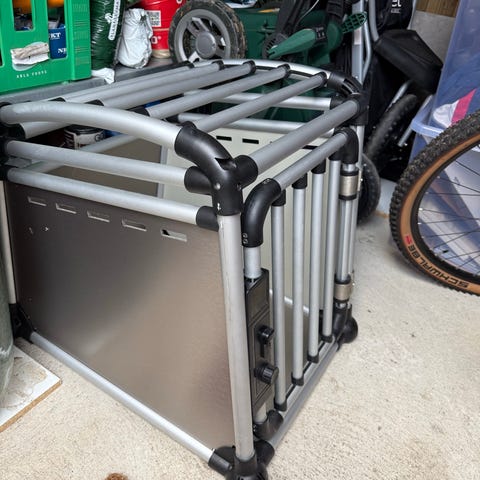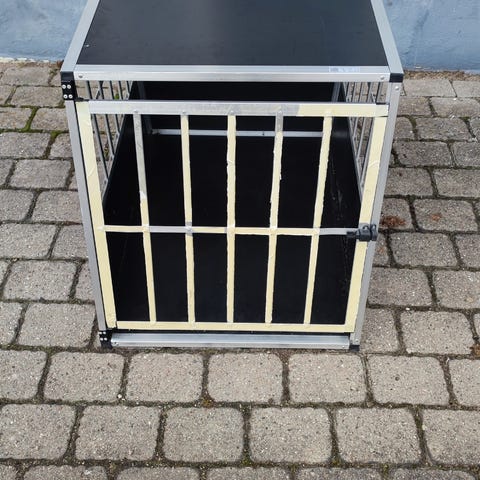 Brugt, men stadig fint bur til en lille/medium hund, med skrå for- og bagside så den nemmere passer i bagagerummet.