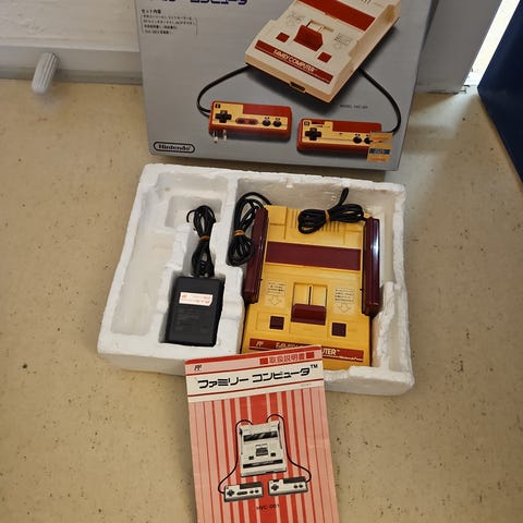 Nintendo NES spillekonsol med tilhørende spil. Klassisk 8-bit konsol, hvor der medfølger flere originale NES-spilkassetter som vist på billedet. Velegnet til brug med kompatible controllere og til afspilning af NES-spil på tv med passende tilslutning.
