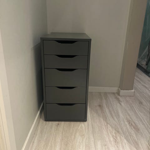 Fin Alex kommode. Fungere som den skal uden problemer, kosmetisk er den dog ret medtaget inde i skufferne, udenpå fremstår den flot.