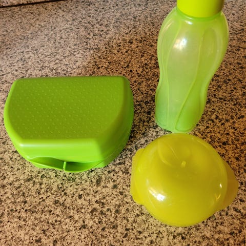 5 opbevaringsbøtter vi har brugt til babymad. Den lilla tupperware kan have op til 80 ml, og jeg vil tro de andre kan indeholde nogenlunde samme mængde. Forskellige mærker.