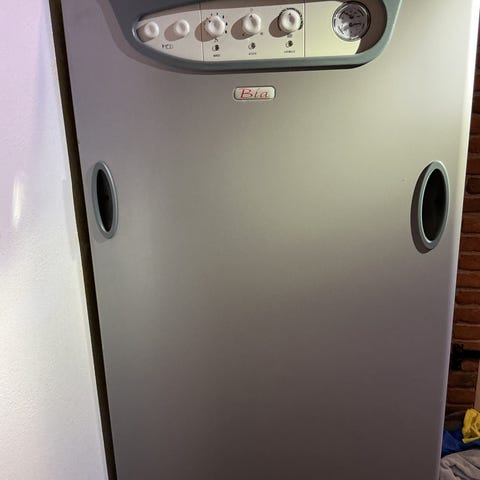 Oliefyr kedel med brænder til opvarmning af bolig eller mindre bygning. Enheden består af kedel med frontpanel, manometre og tilsluttet røgrør. Nederst er monteret oliebrænder. Velegnet til centralvarmeanlæg med radiatorer eller gulvvarme, hvor der ønskes olieopvarmning. Flere slanger og rørtilslutninger ses på billedet, hvilket indikerer mulighed for integration i eksisterende varmesystem. Nærmere tekniske data som effekt, årsmodel og producent fremgår ikke tydeligt af billedet og bør kontrolleres på typeskiltet på selve anlægget.