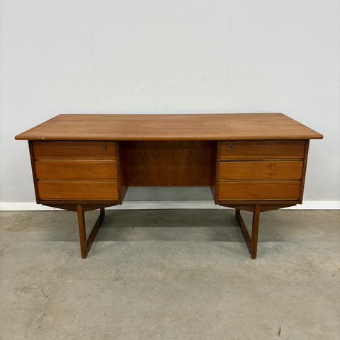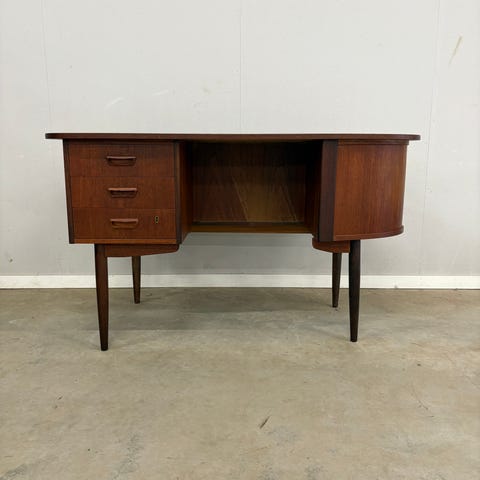 Teaktræ skrivebord med seks skuffer samt hylde bagpå