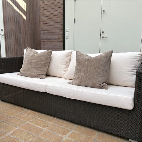 Flot kvalitets havesofa, som dog er billig fordi flet er gået op foran på sofaen, se foto. Hynderne ser næsten ud som ny.