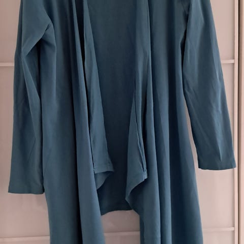 Petroleums blågrøn. Løsthængende med knapper. Har flæser af samme stof på kanten for neden. Har stropper til at løfte ærmerne lidt højere op. Falder flot, skal stryges efter vask. Længde 105. Estimeret ny pris er 400,-