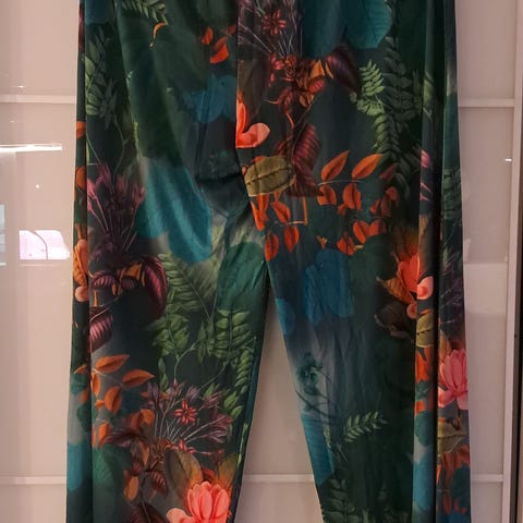 Løst siddende let og sommerlige. Har sidelommer. Lukkes med knap, hægte, lynløs og bindebånd. Har elestik i taljen i rygdelen som sikre at de sidder rigtig pænt. Livvidde: 85 Skridt længde: 80 Længde: 112. Estimeret ny pris er 900,-