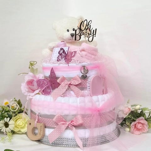 En elegant og håndplukket barselsgave i bløde rosa nuancer – perfekt til at byde en lille prinsesse velkommen til verden.