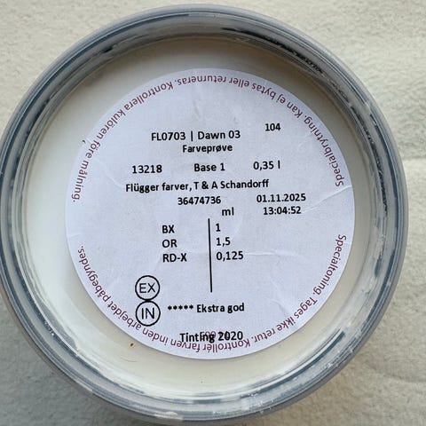 Farveprøve fra Flügger i farven Wise Beige. Er kun benyttet som farveprøve med et par strøg på væggen, så beholderen er stort set fuld.