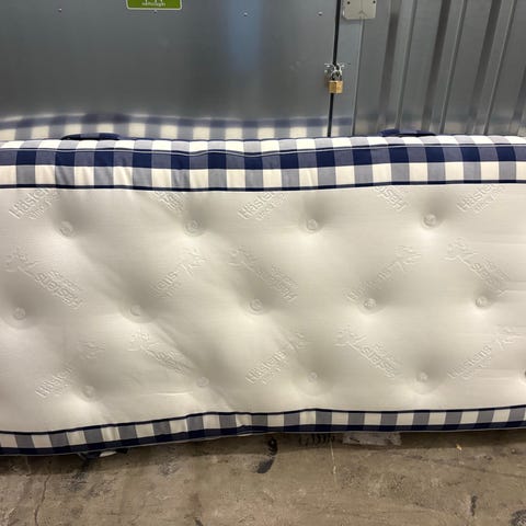 Hästens elevationsseng med klassisk blåternet betræk og hvid, quiltet liggeflade. Madrassen har integreret elevationsfunktion, der styres via medfølgende fjernbetjening med position-, massage- og preset-knapper. Velegnet til brug i elevationsseng, hvor der ønskes justerbar liggeposition og mulighed for let massagefunktion.