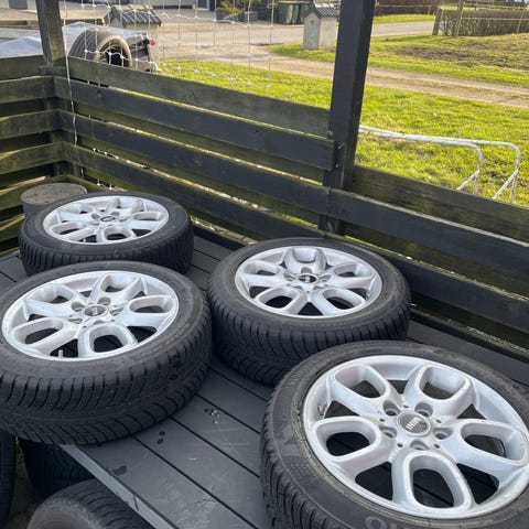 Fine originale 18 tommer alufælge til en Mini One eller Mini Cooper. De har nogle skrammer, men ikke voldsomt, og står med sommerdæk som stadig har belægning til en sæson mere.