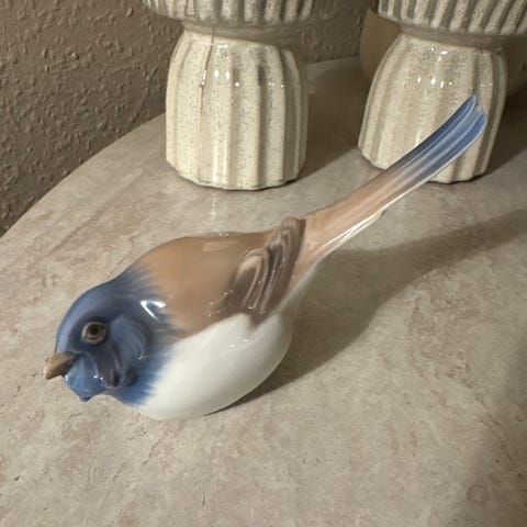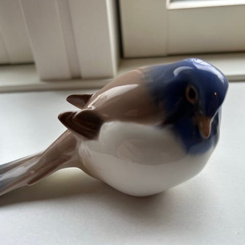 Bing & Grøndahl porcelænsfugl formet som en spurv i brun og hvid glasur. Figuren er glaseret med naturtro farver og har stempel i bunden med krone og Danmark-mærkning. Velegnet som dekorativ figur i reol, vindueskarm eller som del af en samling af danske porcelænsfigurer.