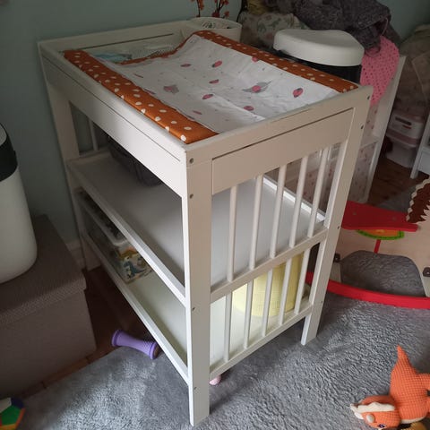 Done by Deer puslebord / reol med flere åbne opbevaringsrum. Møblet er hvidt og puslepladen kan fjernes. Der er en enkelt ridse i møblet under puslepladen. De åbne rum kan bruges til kasser, legetøj eller andet børneudstyr.