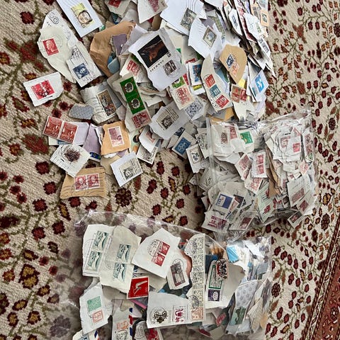 Blandet parti gamle frimærker på klip i forskellige farver og motiver. Frimærkerne sidder på udklip af kuverter og papir i varierende størrelser. Egnet til samlere eller til videre sortering og organisering efter land, motiv eller periode.
