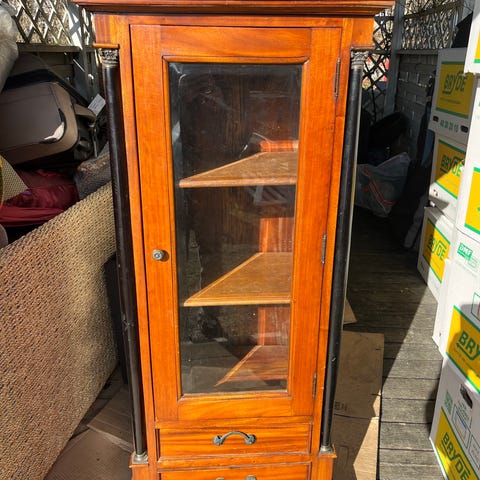 Utrolig flot Oldemor vitrineskab i træ med glaslåge og hylder.
